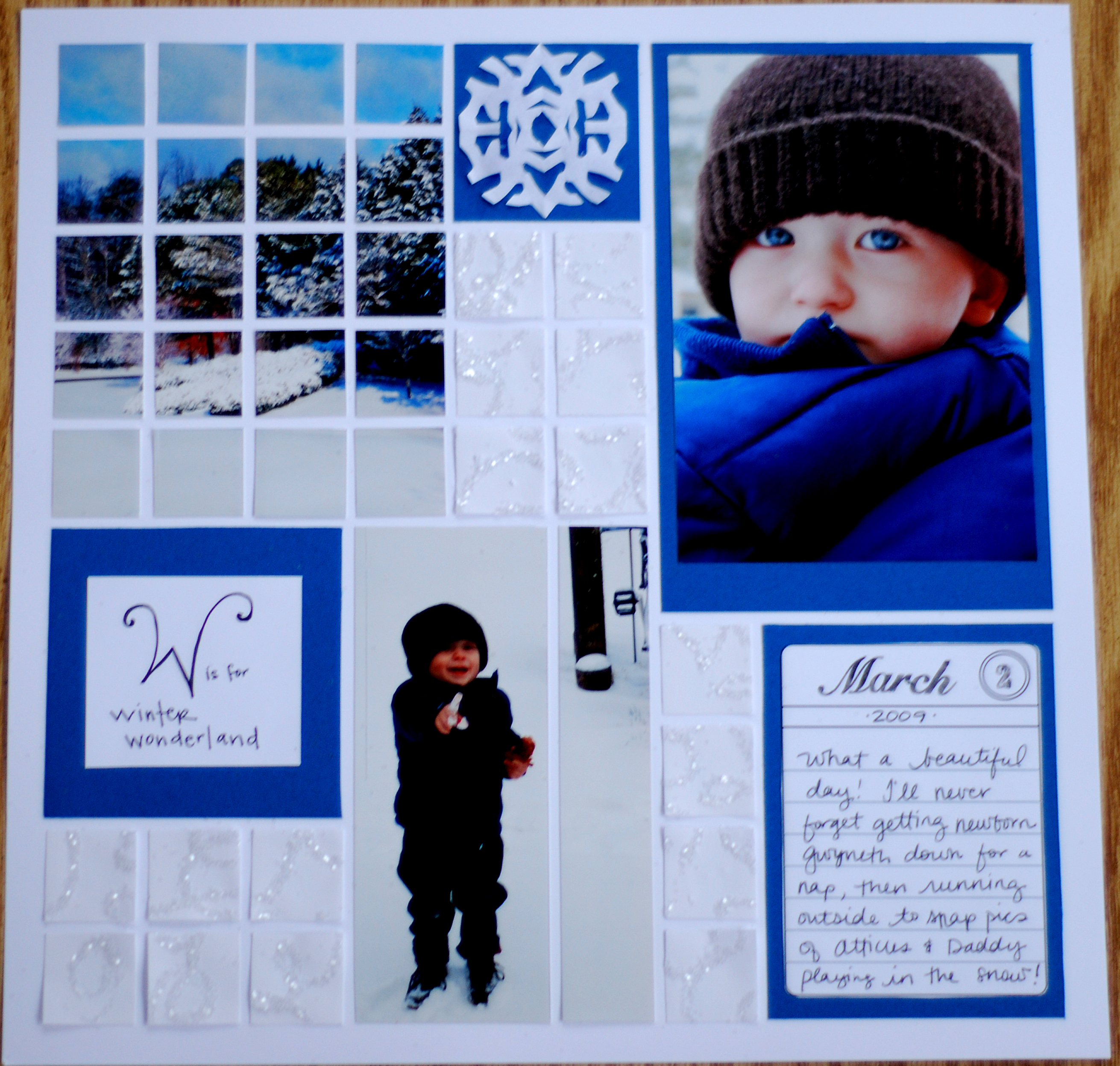 Tips from Theresa Amlong: For the last page I used this photo of a close up of some snow taken recently by my sister Trish Collins. Printed once at 10×12, it makes a beautiful background for my own snow photo.