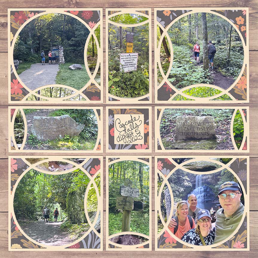 This creates an unusual interlocking design that you can fill in different ways. Paije used photos to fill the long ellipses and cardstock to create an 'x' in the center. The photos are from the murals on the trail, as are the 1x4 strips on this layout.