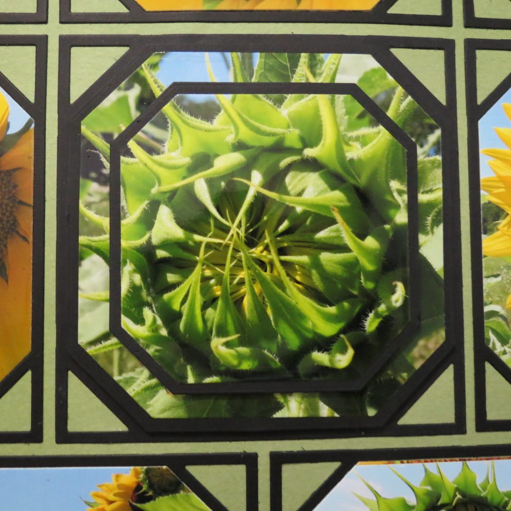 I passed a local farmers rows of sunflowers and stopped to capture a few photos. My assistants from last year were not with me, so I only had the sunflowers cooperation to worry about. I thought they might make a good layout using the Diamond Mines Dies, but as I played around with some of my selected photos, I wasn’t happy with how it was developing. Let me point out a few of the areas that I didn’t like.
