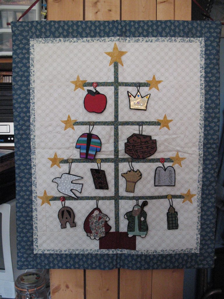 We also took on a Jesse Tree tradition with handmade ornaments for each of the images. I think this would be a good way to store the ornaments as you take one a day and hang them on your tree, or on a branch “tree” or another way to display them. Making them a uniform size to fit in the 2×2 pockets is perfect.