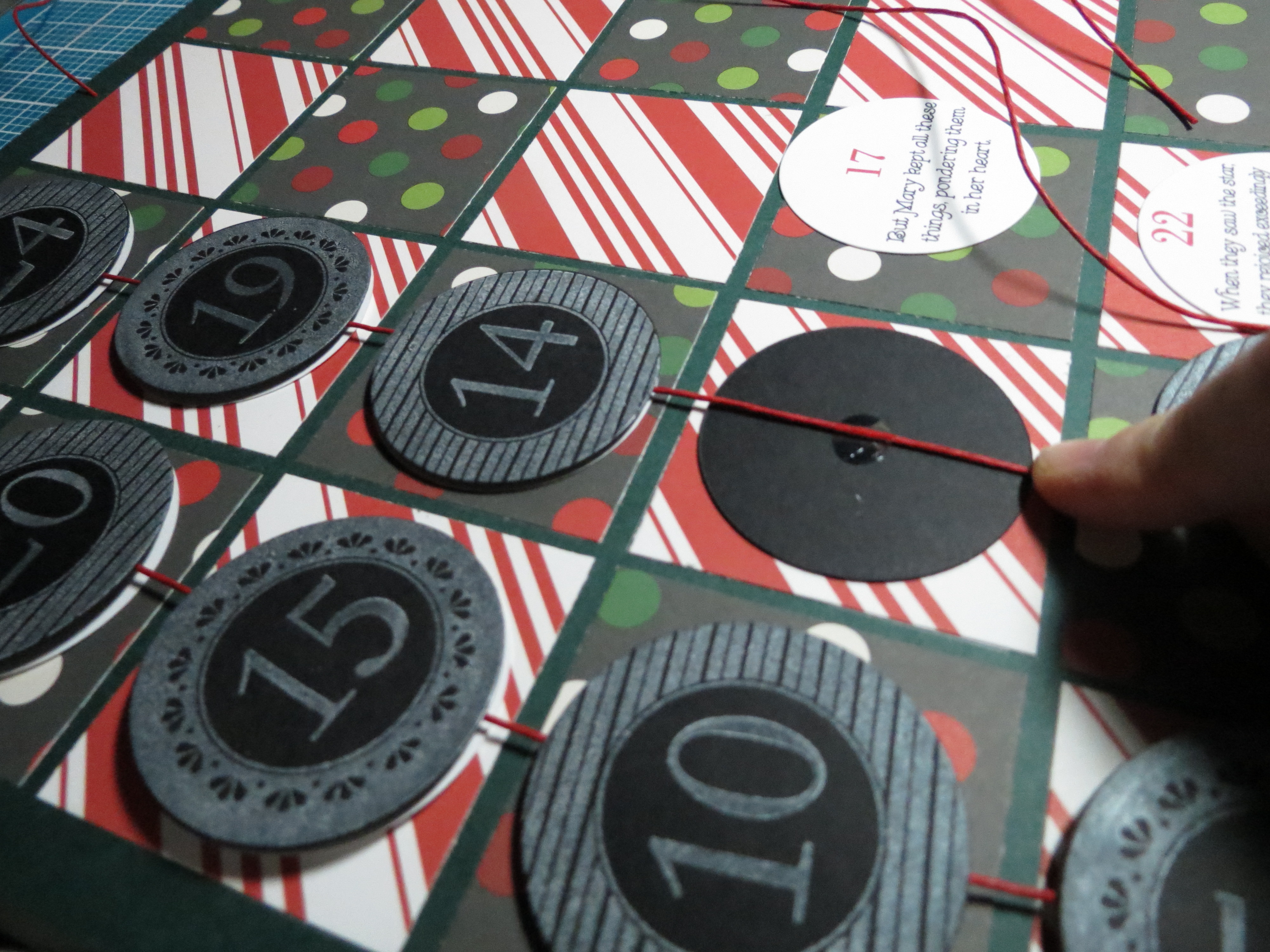 Three steps: first, glue dot to secure cording, next, cover with a square of foam mounting tape and finally, cover with the advent story disc and press together.