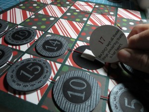 I created 25 pockets using our FREE template for pockets and several colors of cardstock. I used an EK Success 1 ¾” square punch to cut 25 smaller squares from several patterned pages to center on each pocket. I punched 25 small circles in white cardstock and stamped each with a number 1-25 using Tami’s Calendar rubber stamp set.