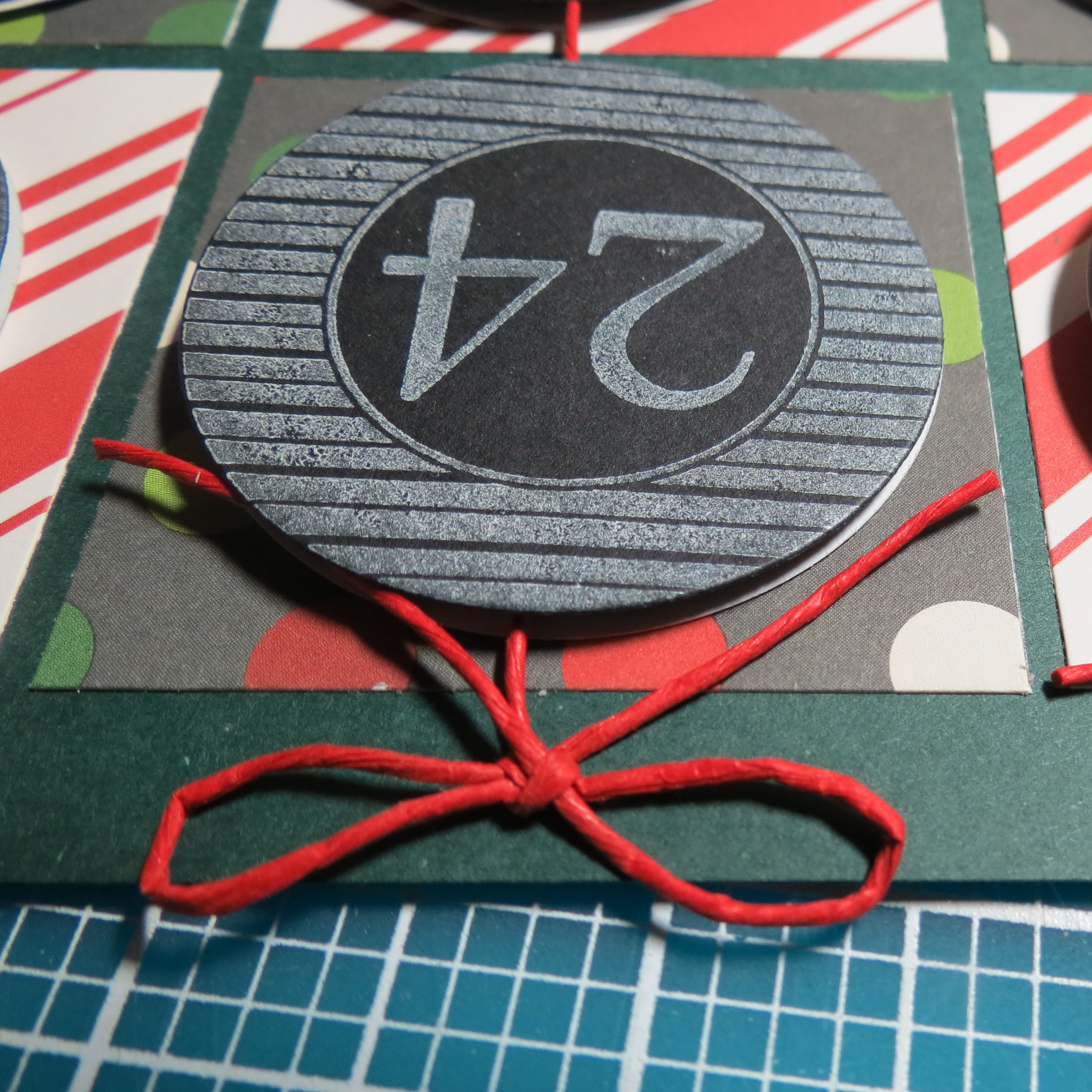 - And most important of all, 25 numbers either stamped on small punched circles or as I used a die to cut tiny ornaments with numbers (Advent Calendar Set from Memory Box.)