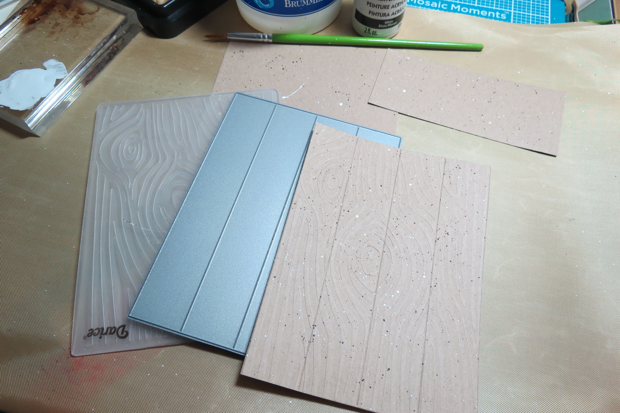 The distressed wood planking look began with the Kraft paper, white acrylic paint and walnut stain ink. I used a paintbrush to flick the white paint onto the paper and then repeat the flicking with a little water downed ink. I put a smudge of ink or paint on an acrylic stamp block and added a small amount of water to thin it out to be able to flick easily. Make sure you do this somewhere that the splatter that will occur, won’t ruin anything it hits! I let it dry, hit it with my heat gun to make sure they’d set and then ran it though in an embossing folder for the woodgrain impression.