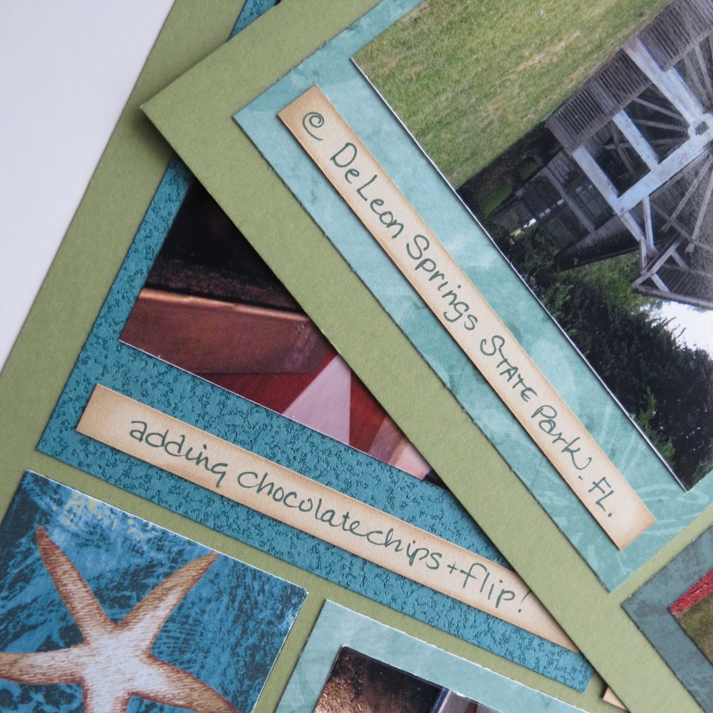 One of the patterned papers I selected from my paper stash to use was a full page of squares with sea shells. The colors complimented the photos, the grid paper and the theme fit the place the photos were taken, Florida, rather than what is going on in the photos, unless you want to count my son’s Hawaiian shirt.