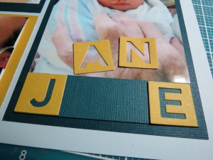 The Alphabet 2 dies have been used as letters only and letters in the blocks. The Number die is used to get the numbers alone on a 2.125”x 1” strip. Using the letters and numbers alone outside of the 1” square allows you to get so many more letters and numbers in a smaller space and arranged anyway you’d like them to be. When I used the letters in the blocks for the name “Jane” I did not put them in blocks on the grid, but added them directly to the matted photo and placed them to keep them within the narrow border on the mat. A lighter shade of the cardstock backs the letter blocks.